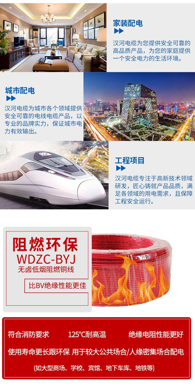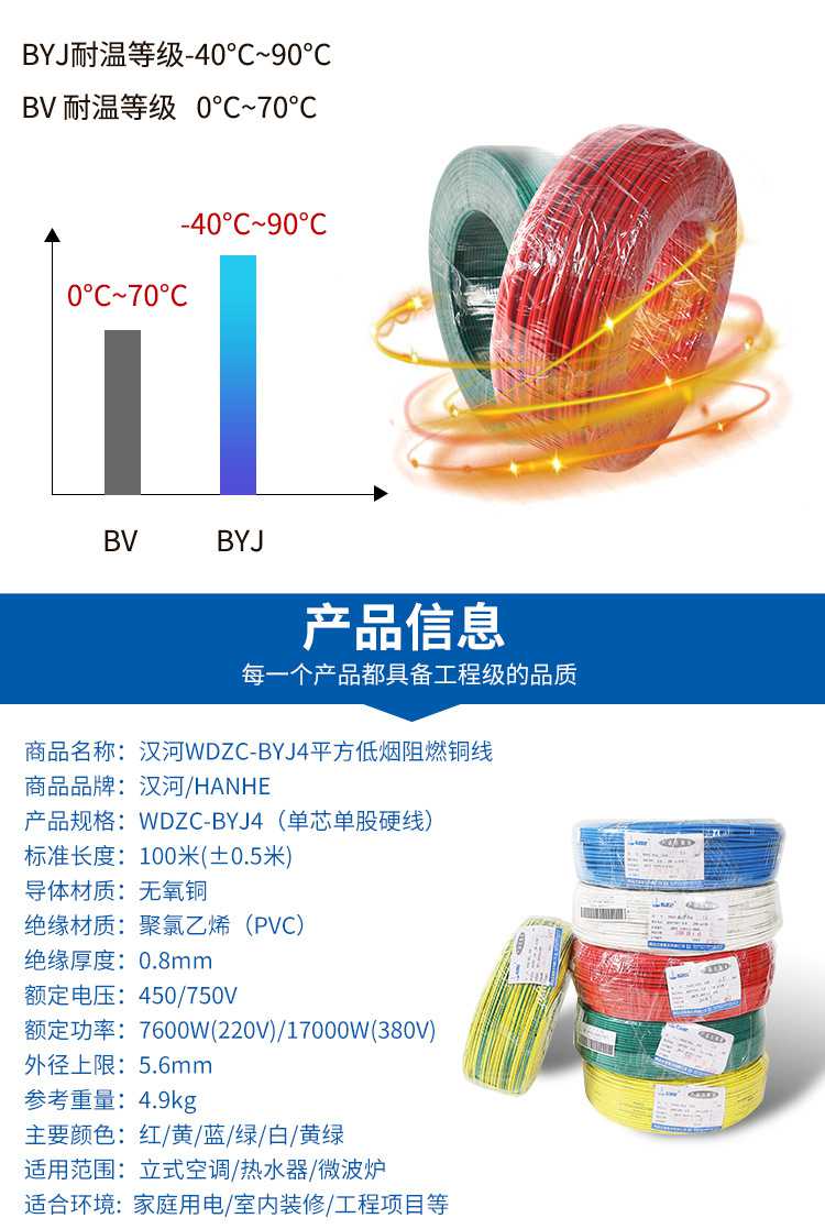 漢河電線低煙無鹵阻燃C級電線WDZC-BYJ4mm2家裝商業(yè)消防用線
